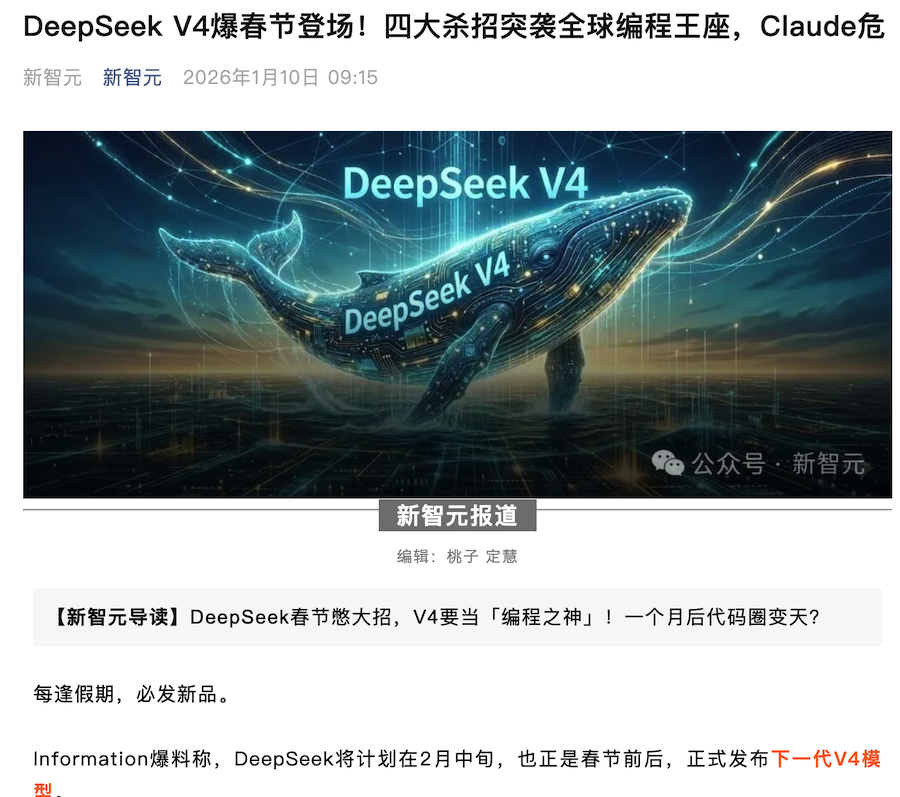 2026年的春节,或许我们不用担心“被AI取代”。 相反,如果有这样一个基于严谨数学架构、逻辑严密且能吃透万行代码的 DeepSeek V4 发布,这或许是程序员们收到最好的新年礼物。
