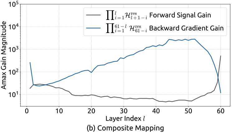 最关键:展示了 HC 的 “Amax Gain Magnitude”(最大增益幅度)在深层网络中达到了 10^3 到 10^5 数量级(对数坐标Y轴显示),这意味着信号被放大了数千倍