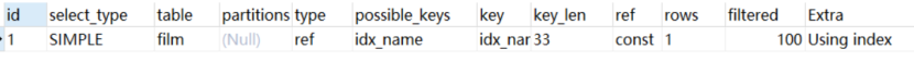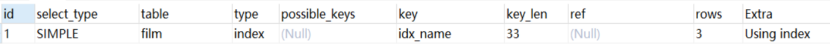 2. film.name建立了idx_name索引,此时查询时extra是using index