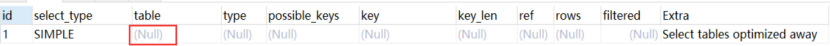 6)Select tables optimized away:使用某些聚合函数(比如 max、min)来访问存在索引的某个字段时