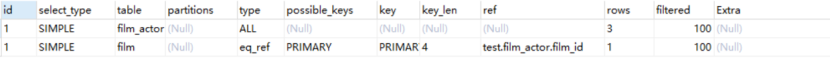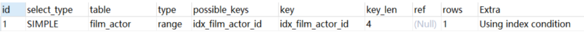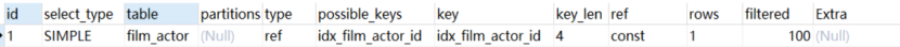 2.关联表查询,idx_film_actor_id是film_id和actor_id的联合索引,这里使用到了film_actor的左边前缀film_id部分。