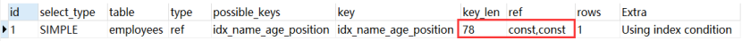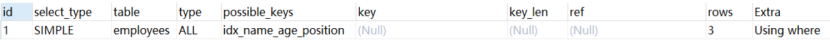 EXPLAIN SELECT name,age FROM employees WHERE name= 'LiLei' AND age = 23 AND position ='manager';