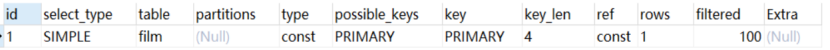 explain extended select * from (select * from film where id = 1) tmp;