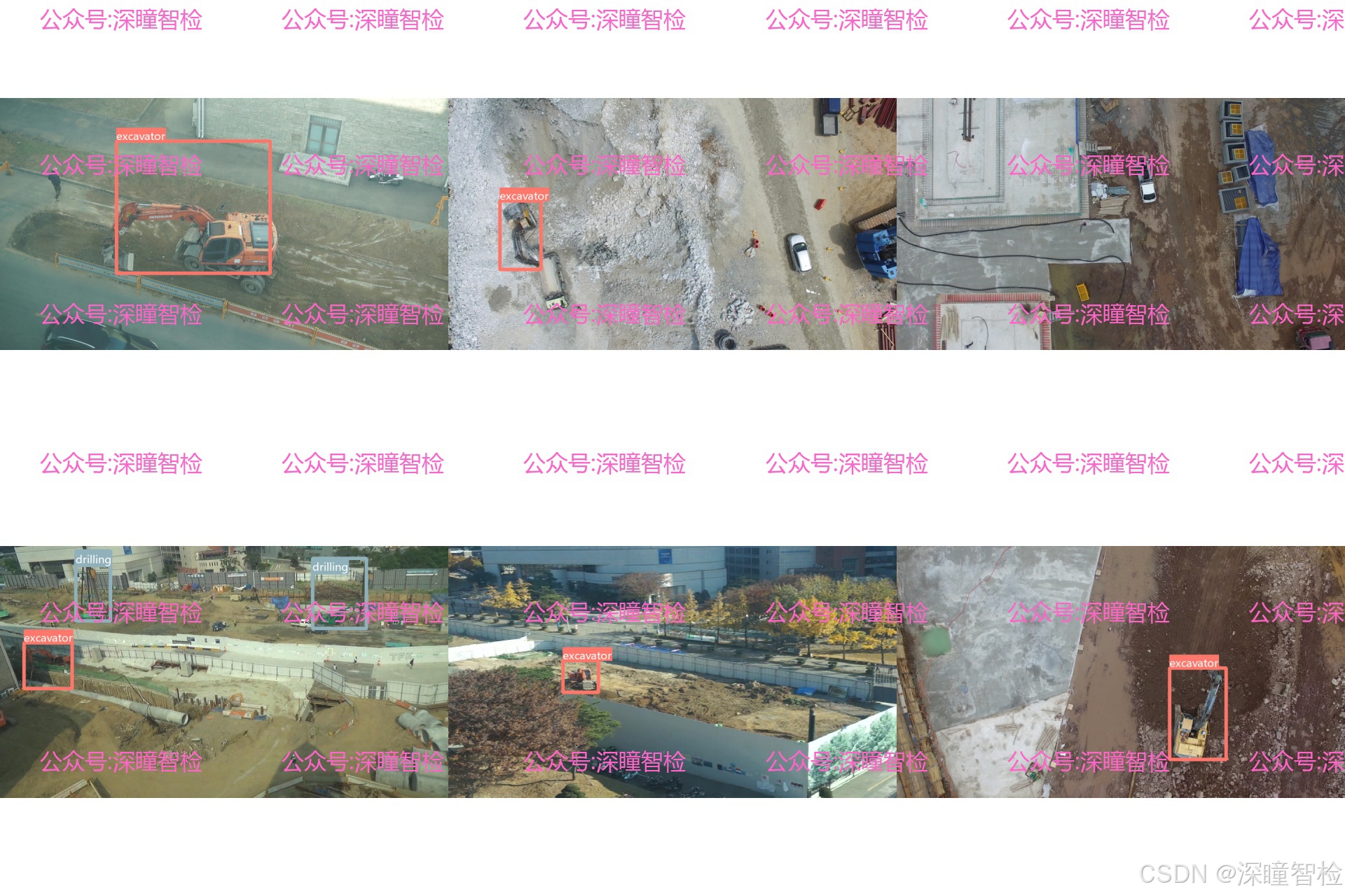 从场景来看,数据集覆盖了不同类型的工地(如土方作业区、建筑主体施工区),包含了不同天气、不同时段的航拍图像,同时涵盖了 “设备遮挡、密集分布” 等真实工地中常见的复杂情况。