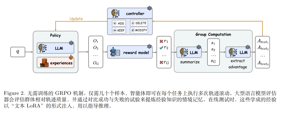 适用于无需大幅性能提升、追求低成本的场景。核心是「无训练组相对策略优化(Training-free GRPO)」: