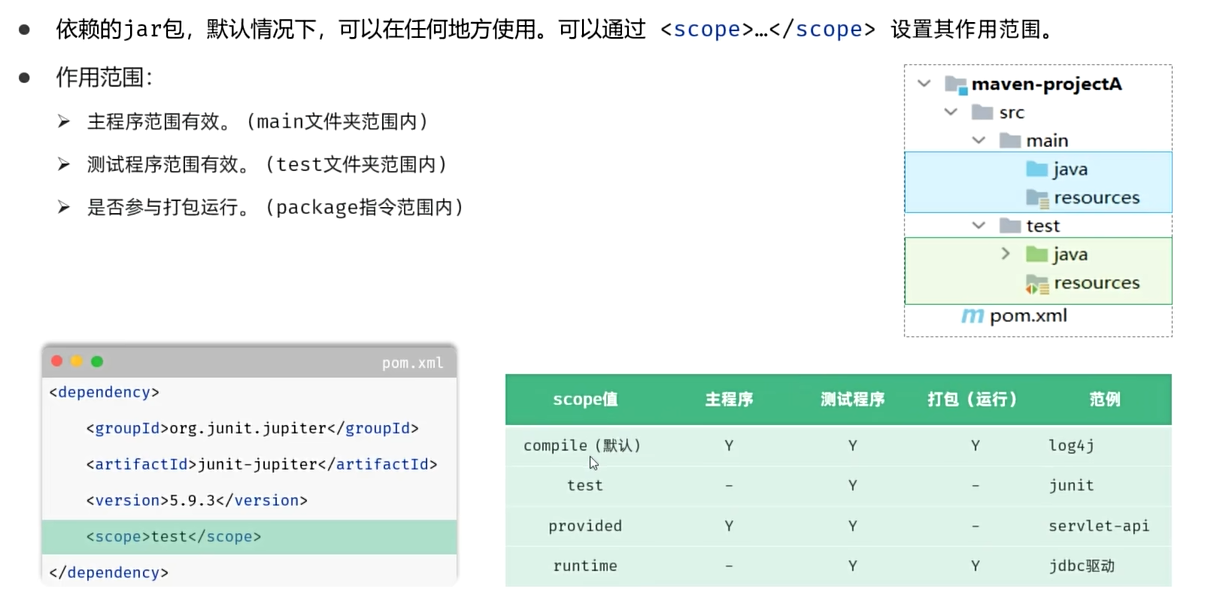 通过依赖范围,使测试代码只能放在test目录