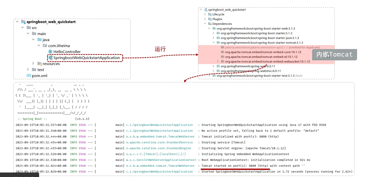 为什么用一个main方法就可启动程序:因为tomcat内嵌在起步依赖里