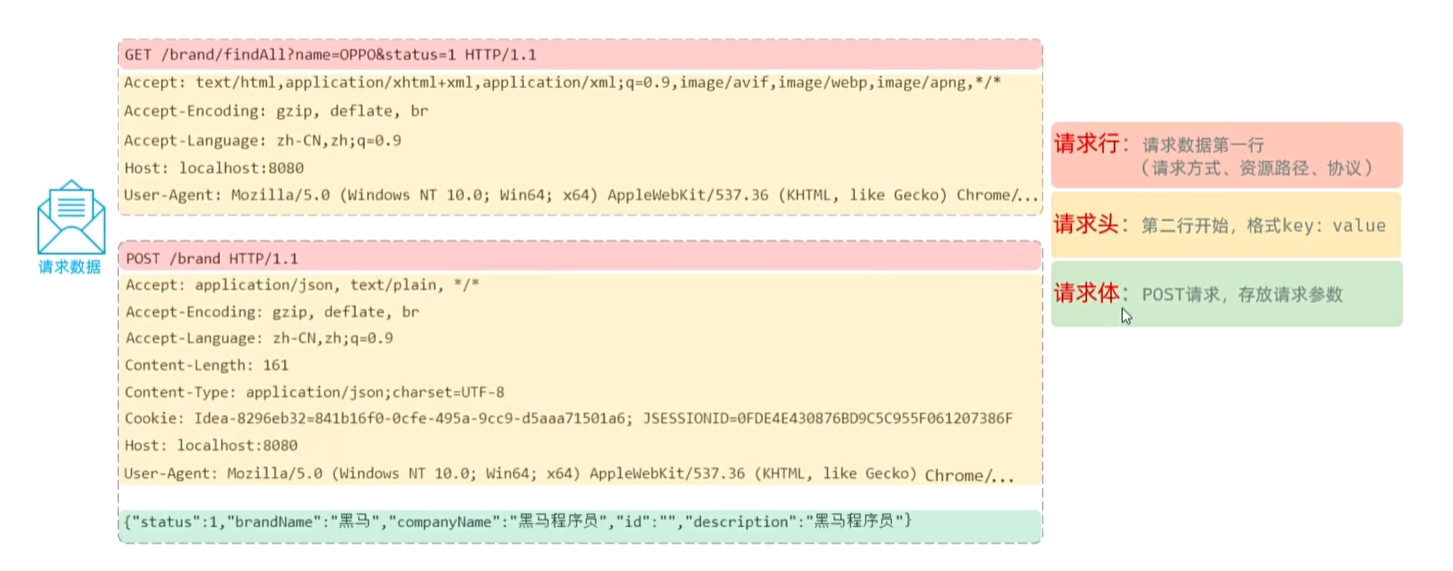 请求数据格式:请求行(方式,路径,协议);请求头(key:value);请求体(针对POST)