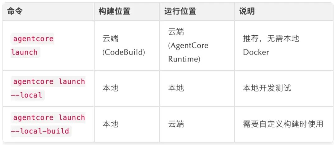 - **本地容器化:**使用agentcore launch --local在本地模拟生产环境