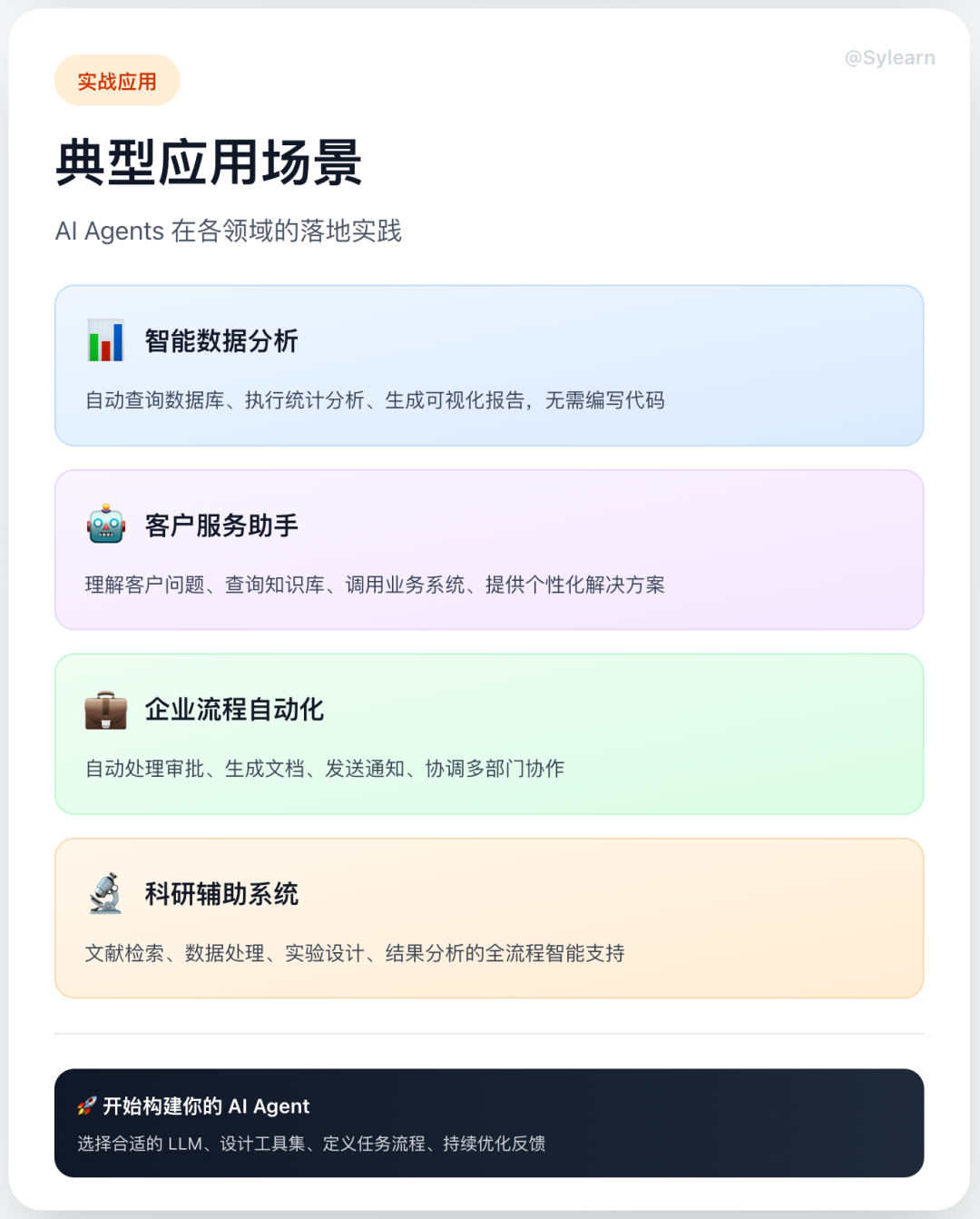 图中列举了四大高频场景:智能数据分析、客户服务助手、企业流程自动化、科研辅助系统。我个人觉得最适合起步的,是已具备清晰数据边界的分析工作流,因为输入、约束和评价指标都容易量化。