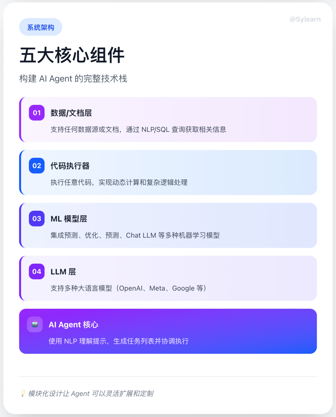模块化设计让 Agent 更易扩展、维护成本更可控。五层结构各司其职: