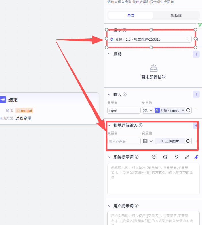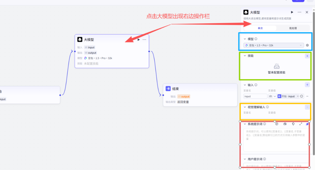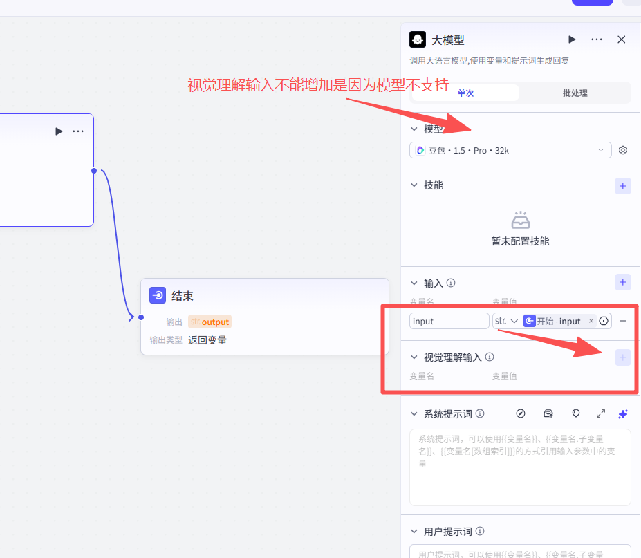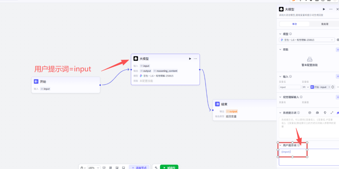 从【添加节点】里面找到【大模型】,把它和【开始】【结束】连起来。