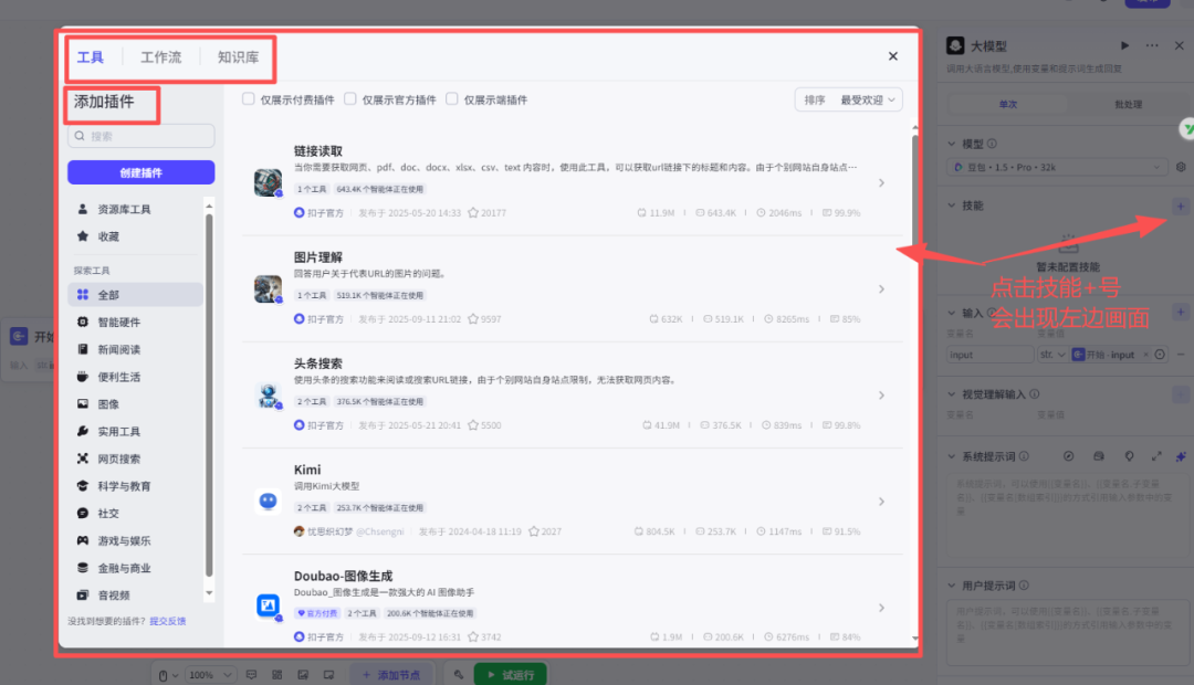 大模型中的技能就像是它的工具库,你可以在里面添加插件、工作流以及知识库等等。