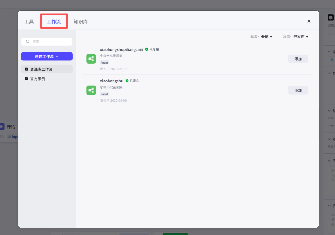 注意工作流完成之后一定要点击发布才能够在智能体中找到!