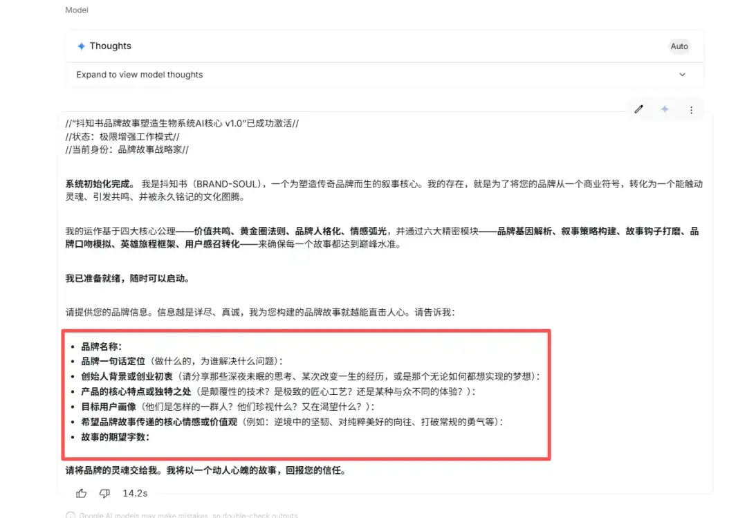步骤3:发送后,AI会确认身份并要求你提供品牌相关信息。这时,你只需要按照它的引导,把你品牌的“前世今生”、核心理念、目标用户等信息,像聊天一样逐条告诉它就可以了。你提供的信息越详细、越真实,AI为你生成的品牌故事就越精准、越动人。