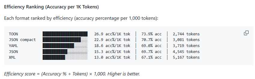 基于这个对比,我们可以发现 JSON 中有大量的大括号、重复的键名消耗了额外的 token,但是在空格、换行上,TOON 比起 JSON 不一定能带来实际的提升。此外,关于 characters / tokens的比值,JSON 数据是 2.98,TOON 数据则是 2.75 。即优化 n% 的字符,也没办法减少 n% 的 token 消耗,说明 TOON 数据中每个 token 包含的字符数更少。