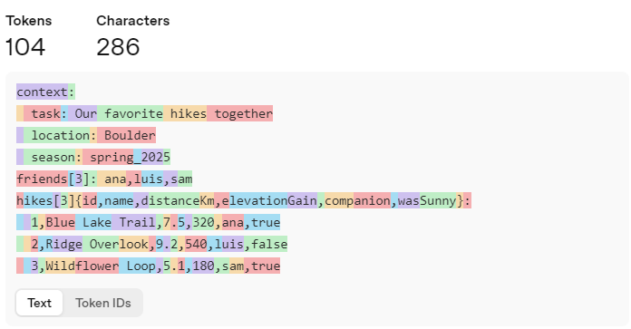 TOON 数据的 token 计数为 104: