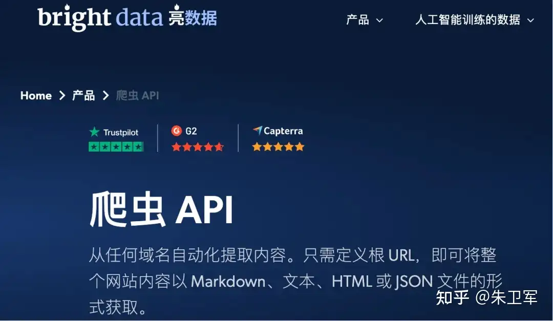 这里大概介绍下亮数据,因为网页抓取器是这个工作流的核心节点。亮数据是专门做数据采集的平台,有抓取器、解锁器、远程浏览器、MCP等工具,可以简化网页请求的复杂度,因为它把反爬处理技术嵌入在接口里,用户只需要提交需求和url就能直接采集到数据。