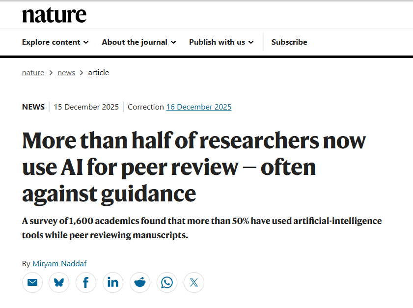 近日,《自然》杂志发布了一篇引爆科研圈的重磅调查:超过50%的研究者在同行评审中使用AI工具。这个数字来自瑞士出版商Frontiers对全球1600名学者的问卷调查,结果不仅证实了许多人此前的猜测,更暴露了AI在科研评审中的广泛渗透与潜在风险。