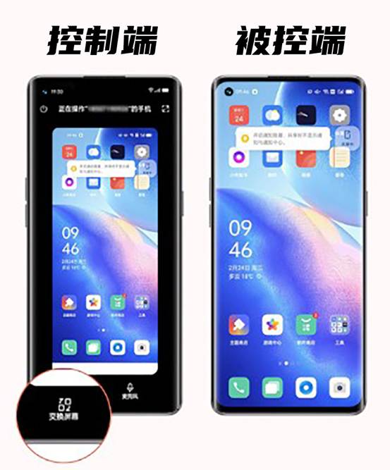 在控制端oppo的左下角有一个【交换屏幕】按钮,点击即可互换控制端和被控端。