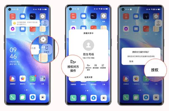 第四步,被控端的OPPO会出现一个类似悬浮窗的圆矩形,上面写着【共享中】。点击【共享中-授权对方操作-授权】。然后控制端的oppo就可以开始远程操作。