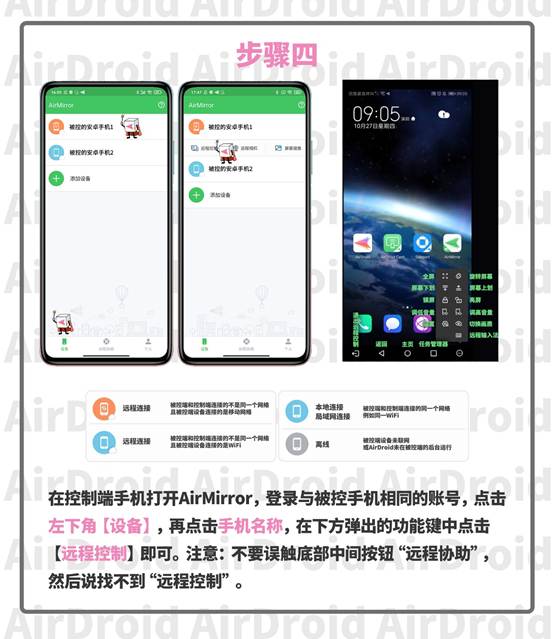 因为华为和OPPO自带功能无法连接,所以忘带其中一台时不能依赖自带的远程功能救济,这时候就可以考虑在控制端手机(例如华为)安装AirMirror,在被控手机(例如oppo)安装AirDroid,两手机登录相同账号,实现远程控制。这个方法可以用于所有安卓7及以上版本的手机、鸿蒙1到鸿蒙4版本的手机。