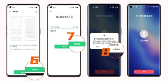 第二步,被控的oppo手机依次点击【设置】【连接与共享】、【屏幕共享】、【发起共享】,再点击【允许】账号授权。账号授权后,再次点击【发起共享】,输入控制端的手机号,再点击【发起邀请】,点击【立即开始】,然后等待控制端接受邀请。