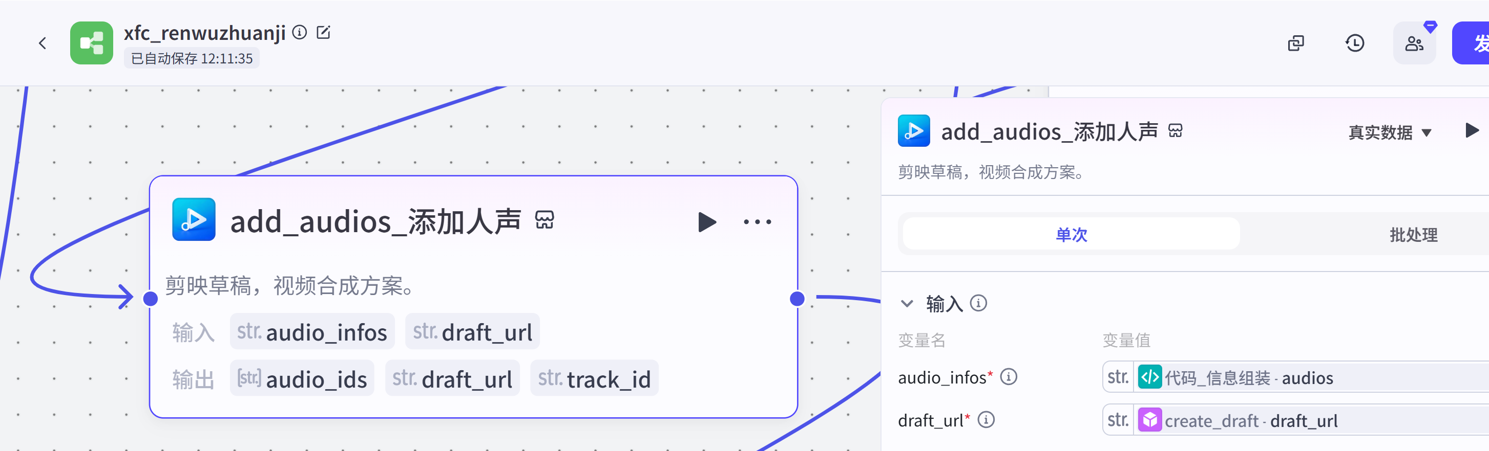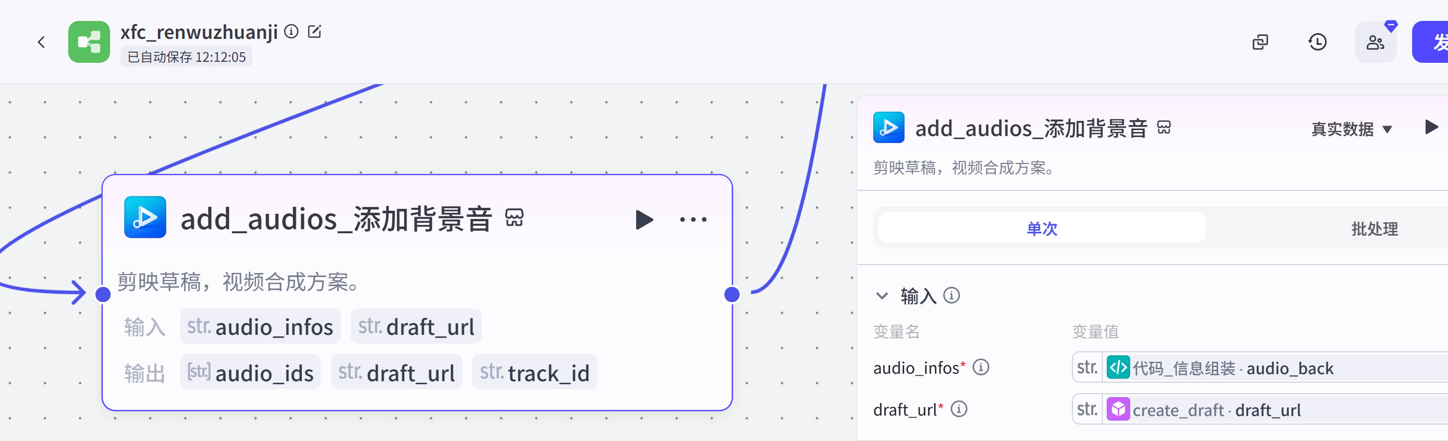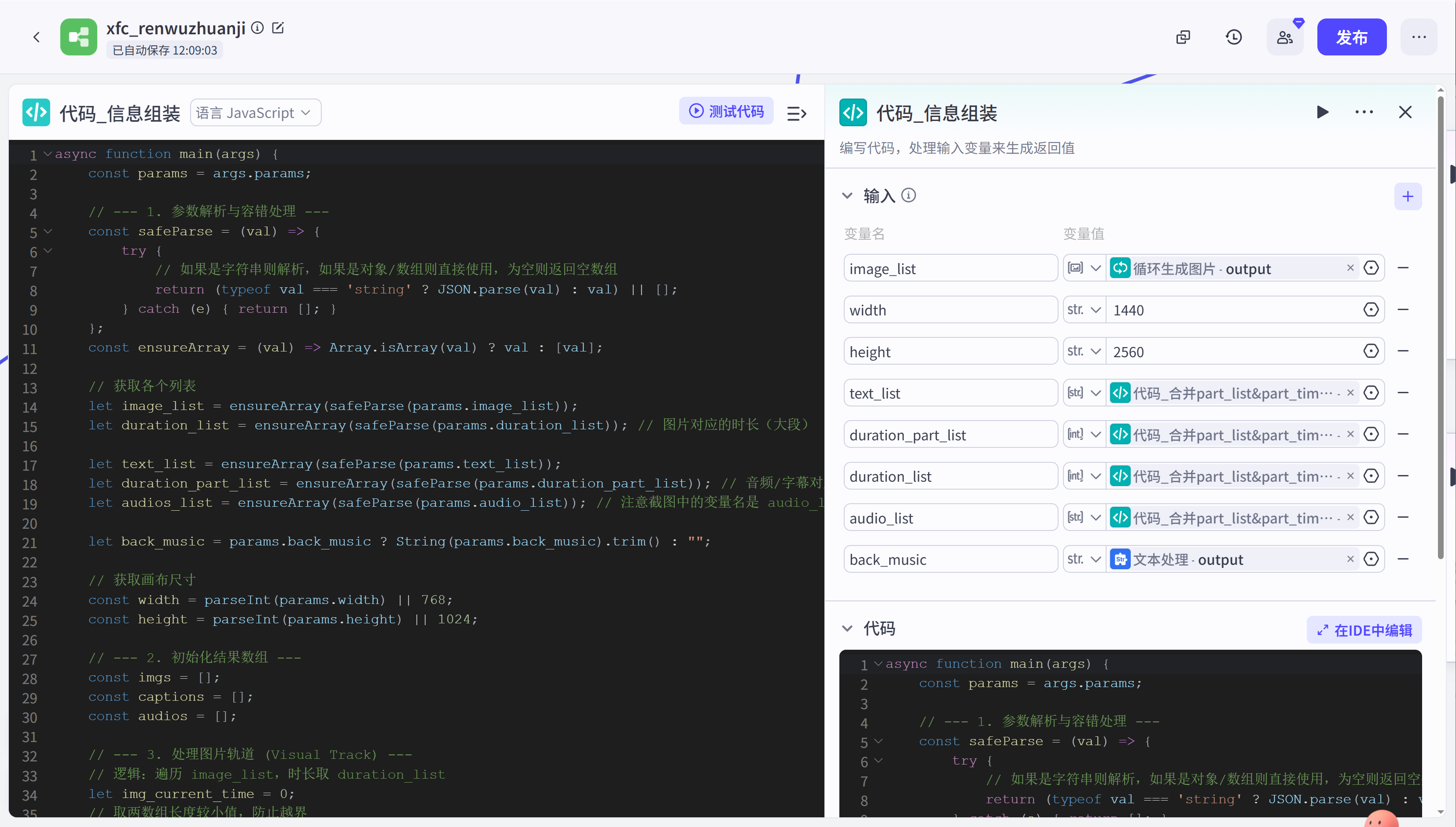 信息组装代码:在前置节点中我们生成了图片,背景音乐,配音,字幕这几个视频要素,该节点就是将前置生成的视频要素进行数组格式规整,成为视频剪映小助手需要的格式。这一步也可以用插件节点来实现,看你自己。