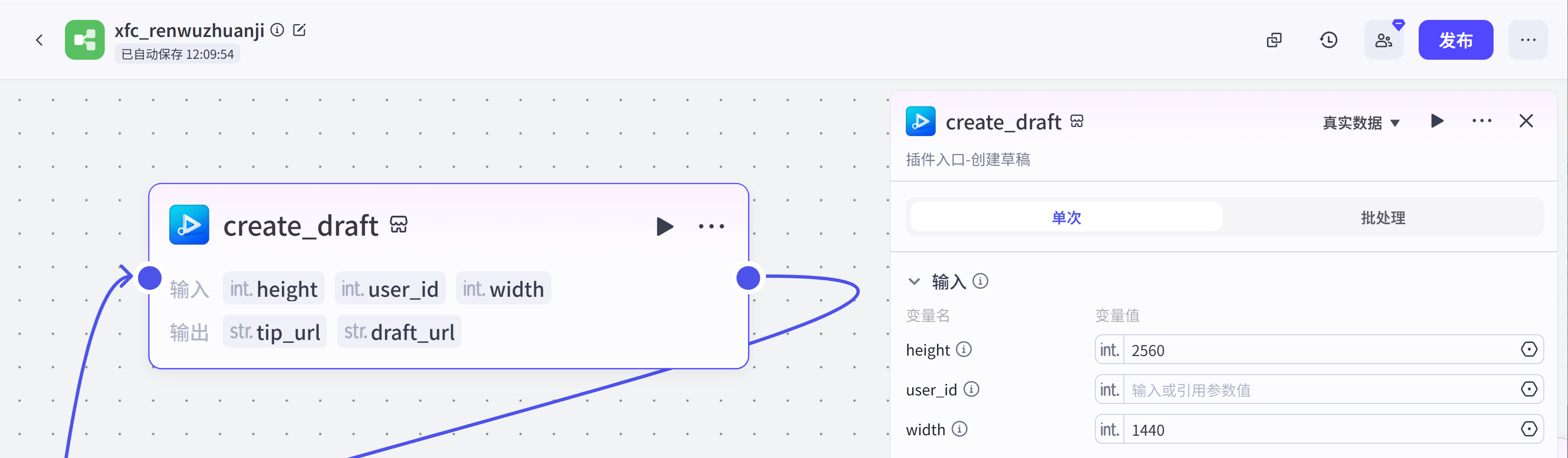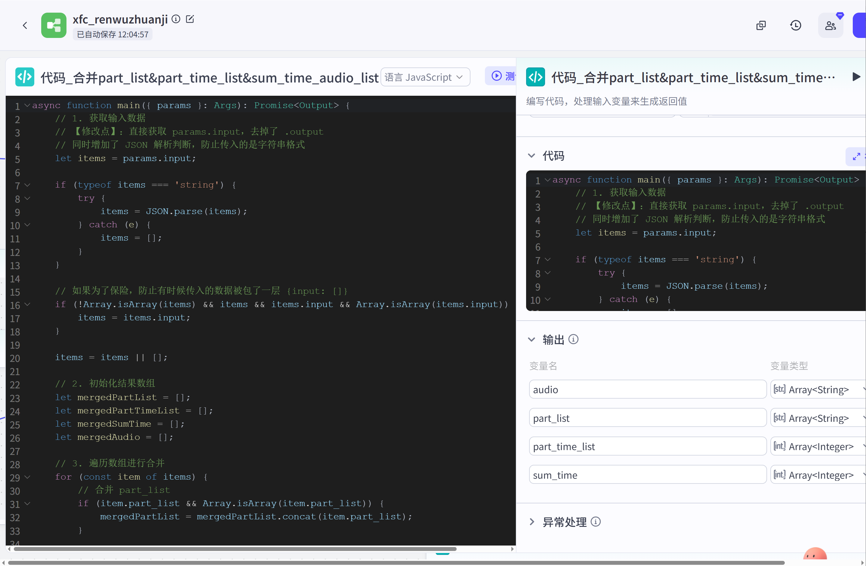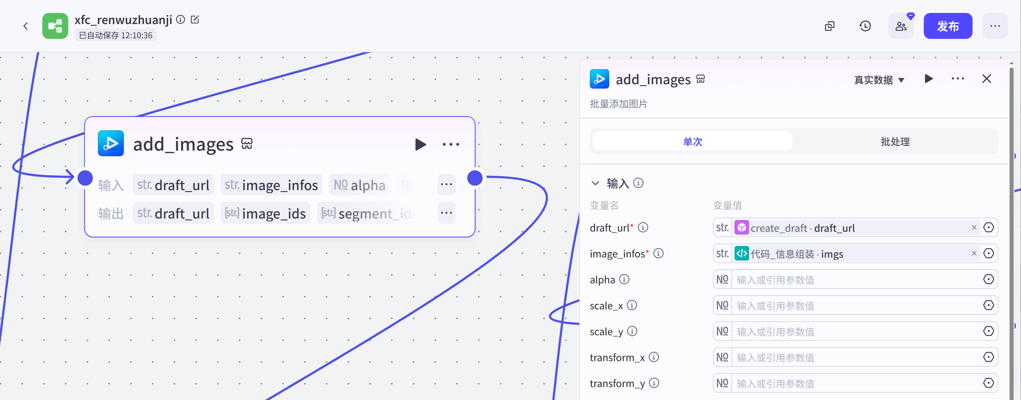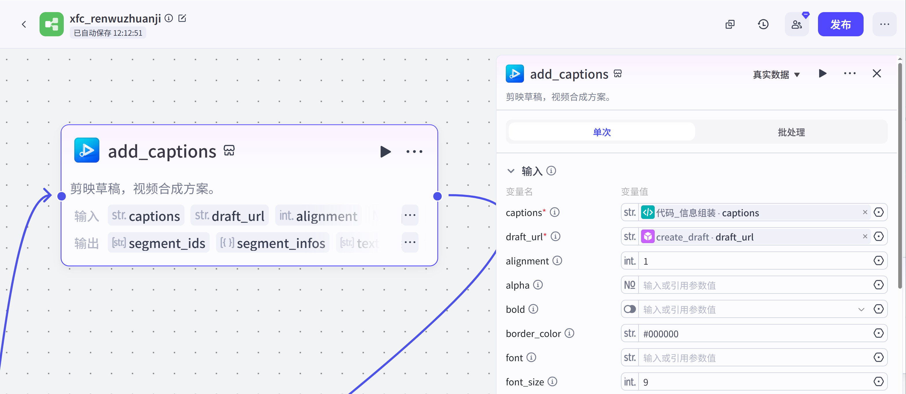 信息组装代码:在前置节点中我们生成了图片,背景音乐,配音,字幕这几个视频要素,该节点就是将前置生成的视频要素进行数组格式规整,成为视频剪映小助手需要的格式。这一步也可以用插件节点来实现,看你自己。