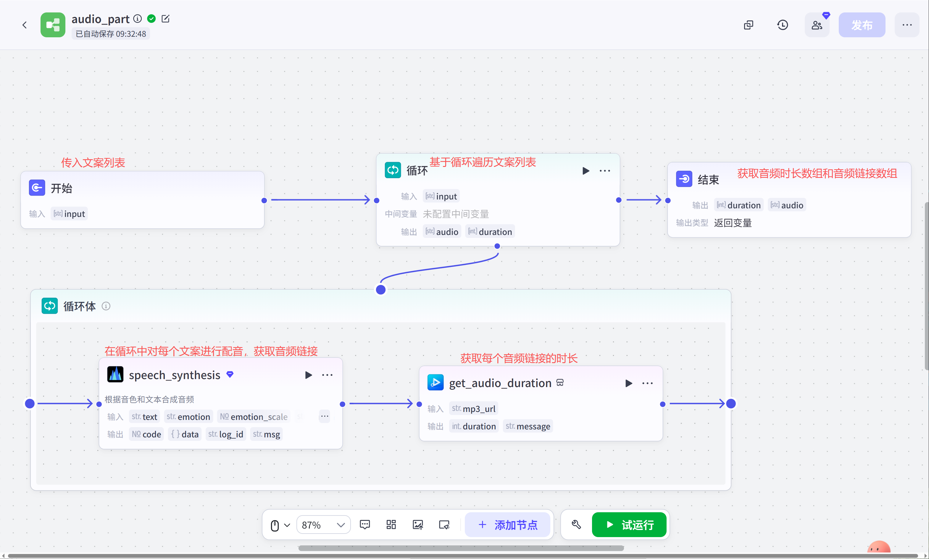 audio_part(文案配音与获取时长子工作流):这个工作流主要是处理基于text_splitter口播稿分割打散后的文案进行配音和获取配音时长操作。