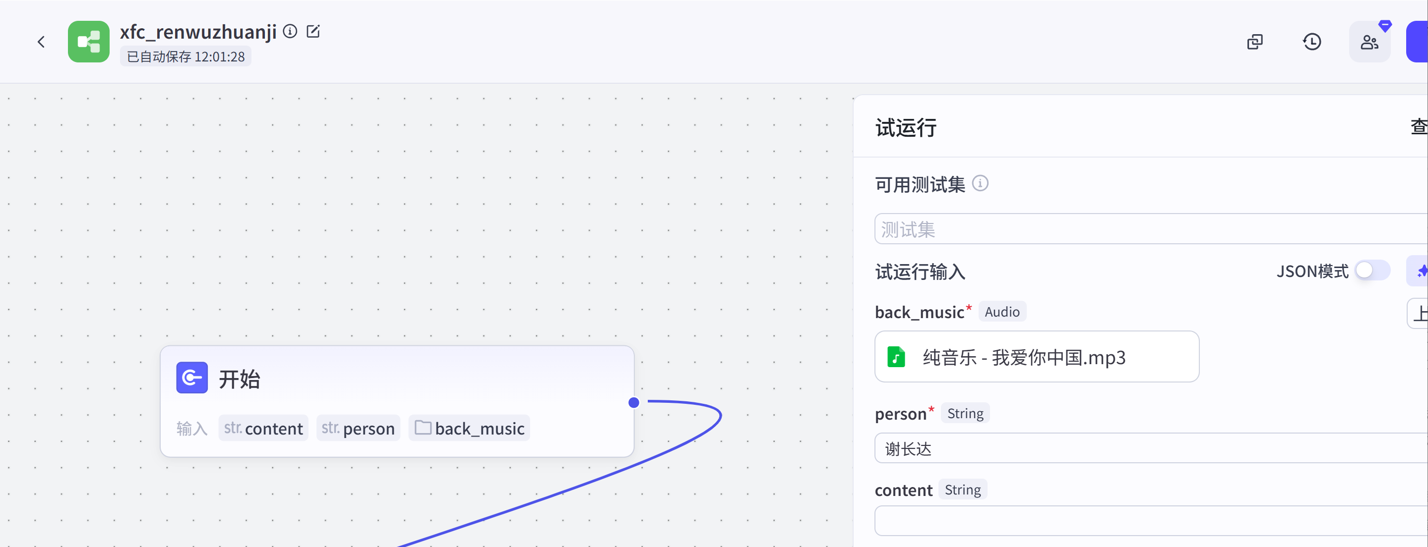 开始节点:开始节点传入的参数主要有back_music文件(.MP3),person(人物名字),content(视频文案,如果你想自定义文案可以直接传入)。