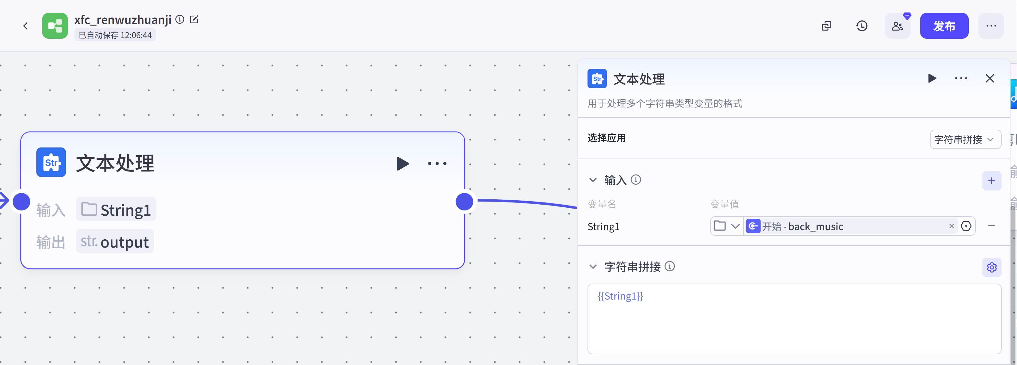 文本处理(获取背景音乐链接):这个节点是文本处理节点,它的功能是根据开始节点上传的.mp3背景音乐提取音乐文件链接地址。