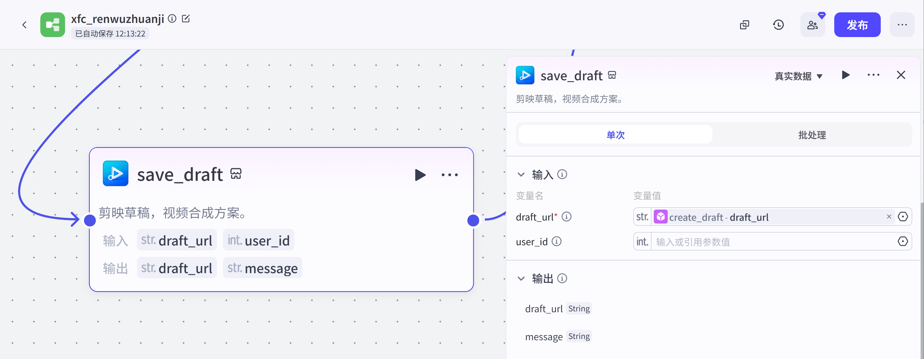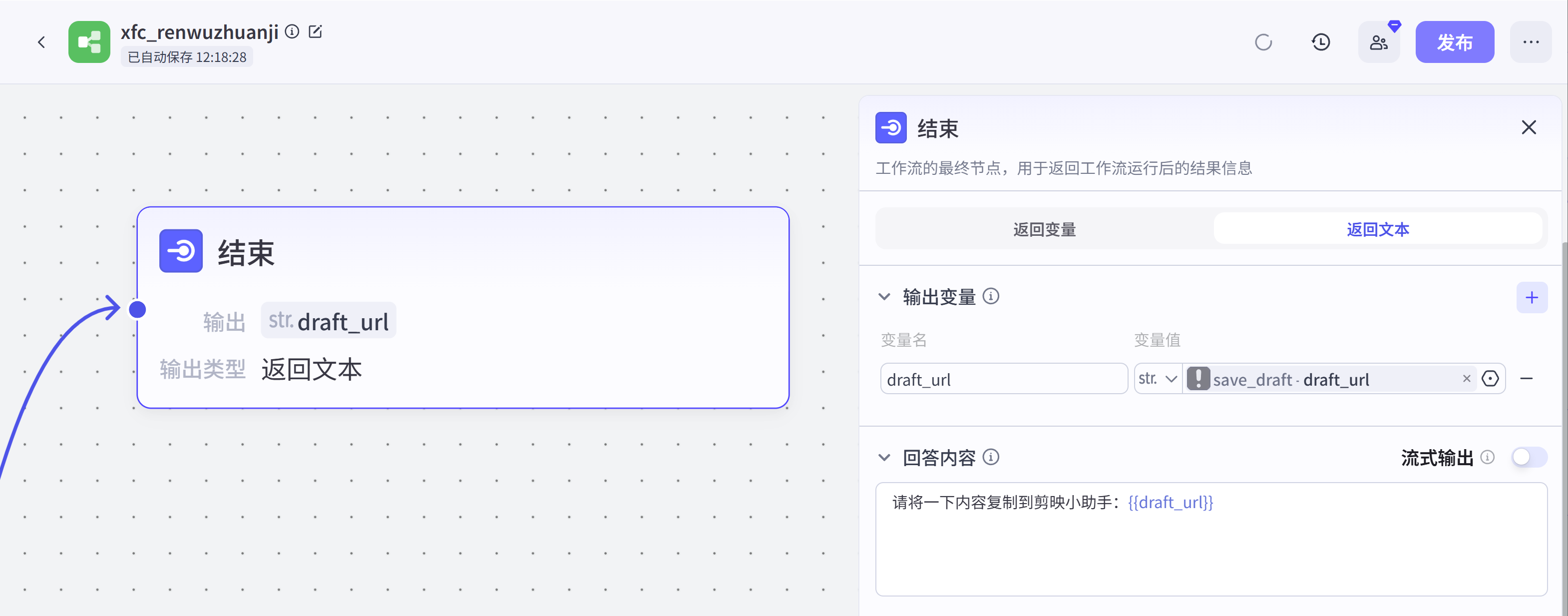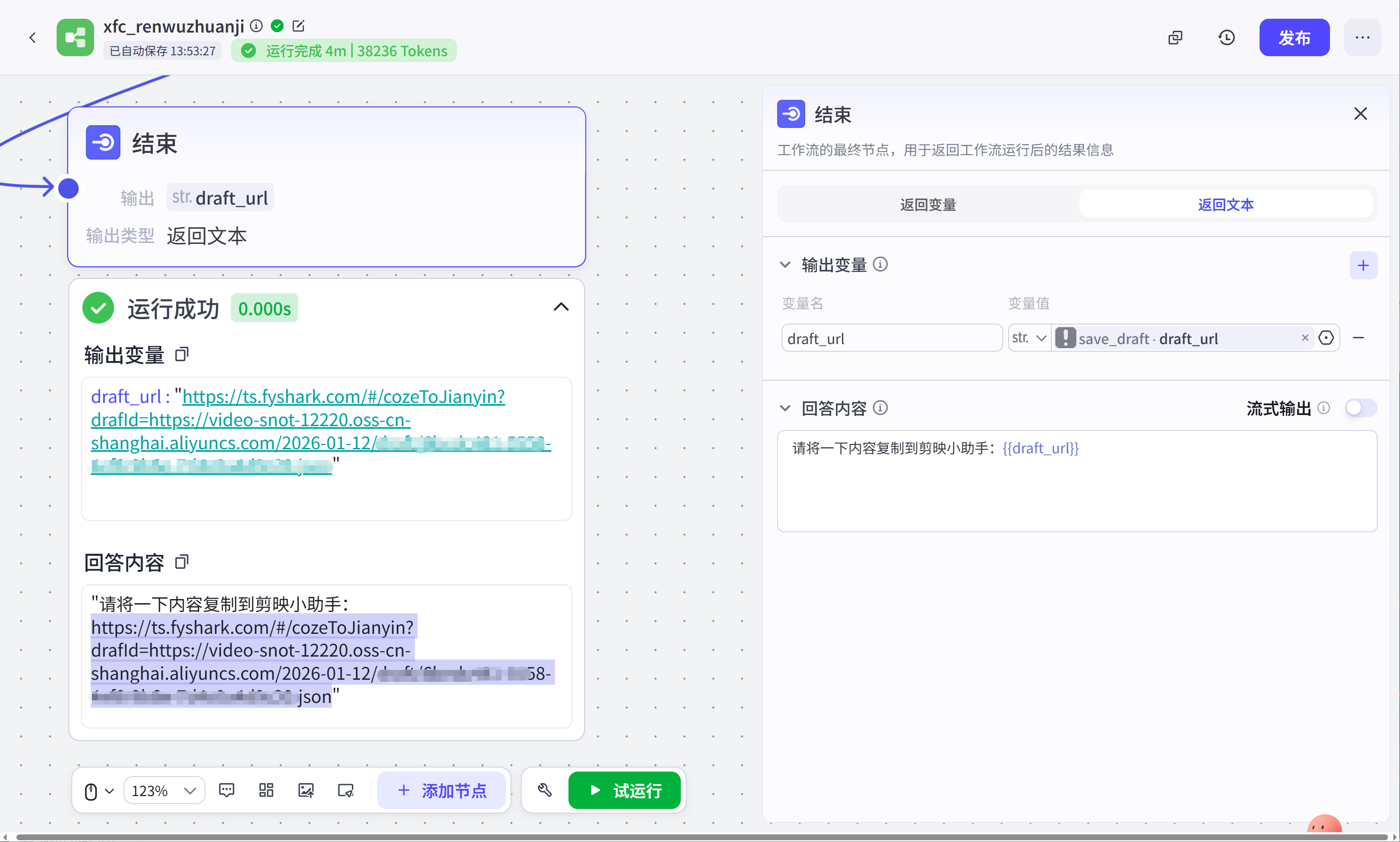 结束节点:结束节点接收的是save_draft节点输出的剪映草稿,可用于合成最终视频。