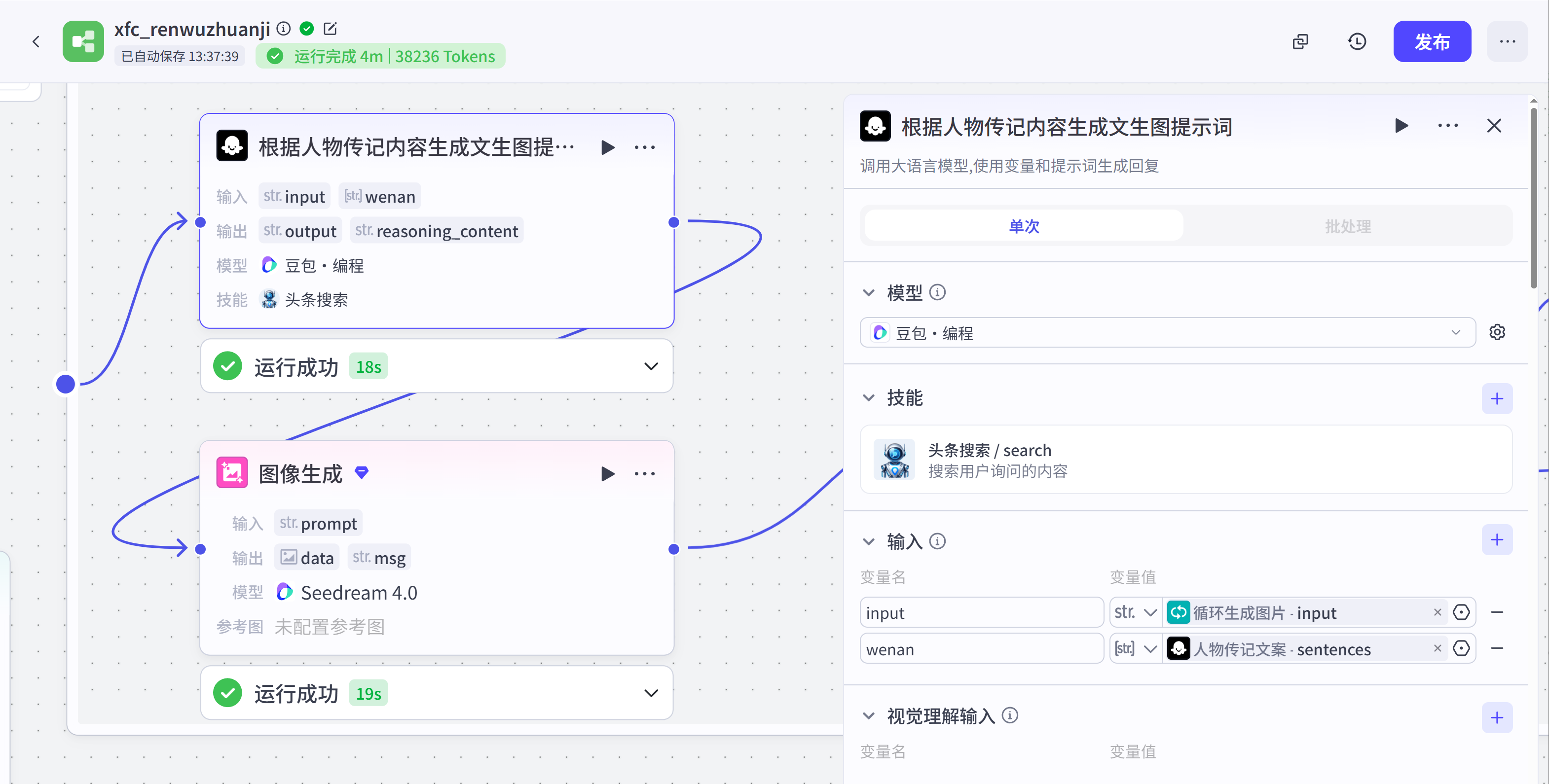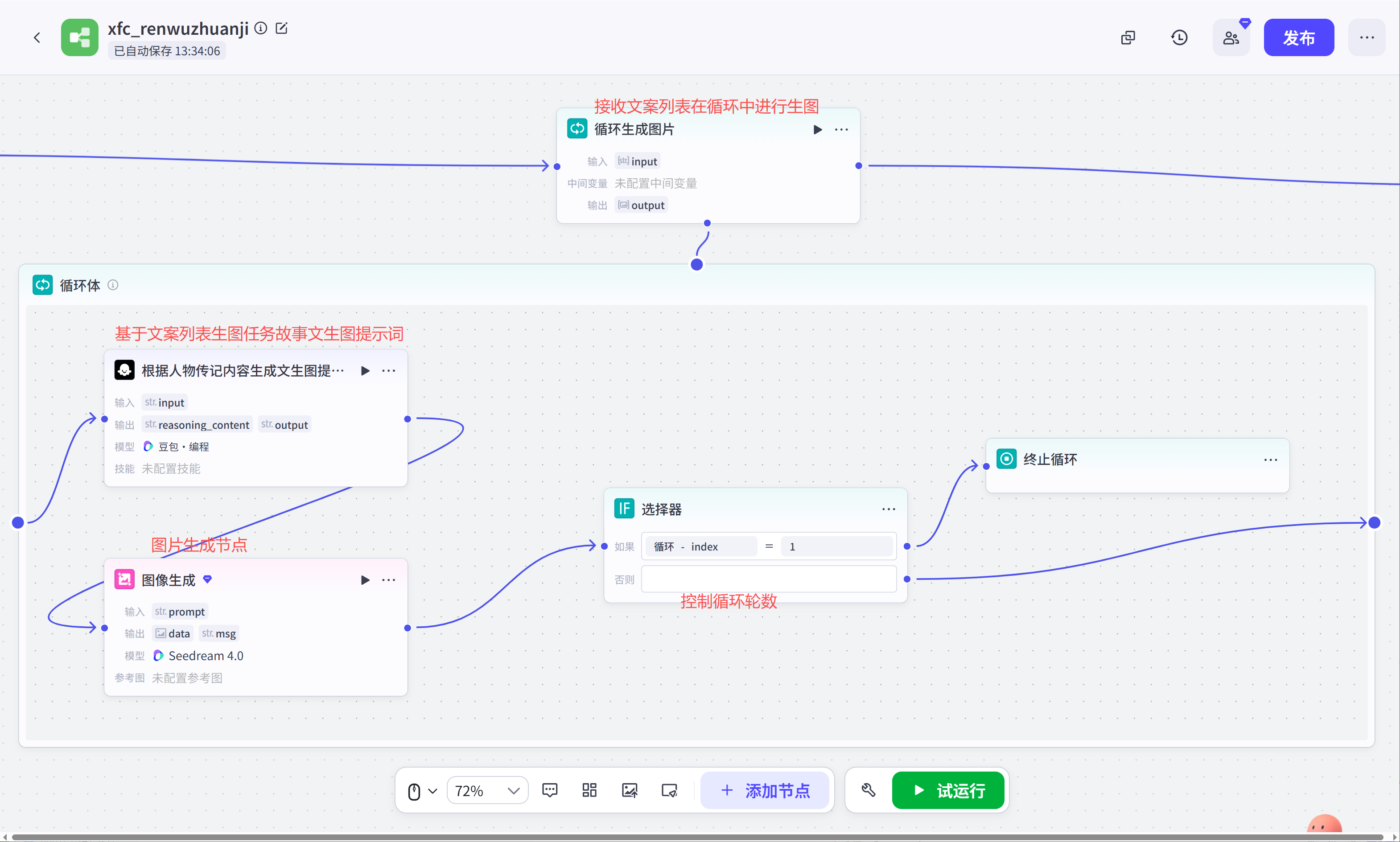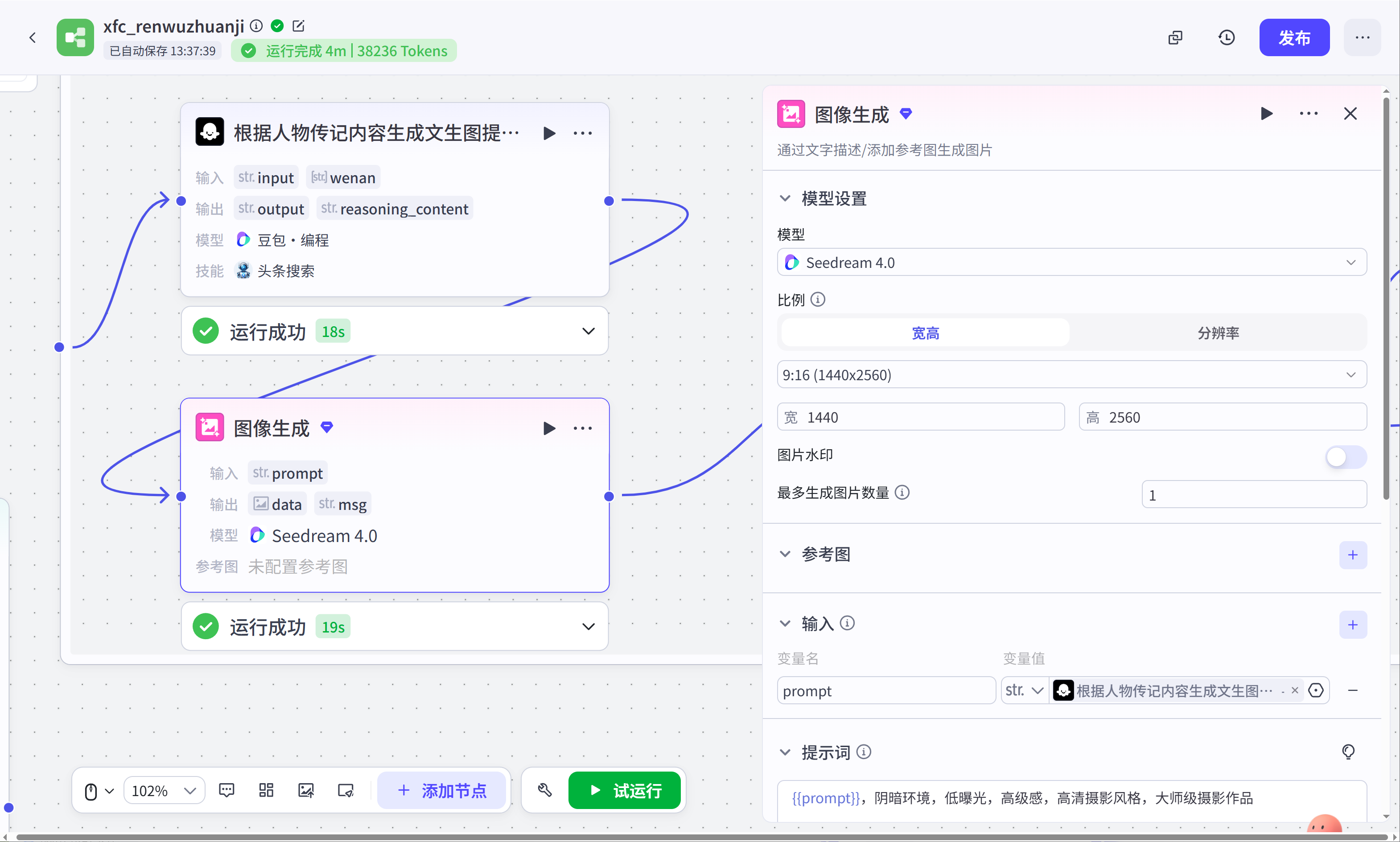 循环生图—图像生成:这是扣子内置的图像生成节点,模型采用Seedream4.0模型,绘制比例采用9:16,绘图提示词采用循环生图—根据人物传记内容生成文生图提示词(大模型)输出的文生图提示词。