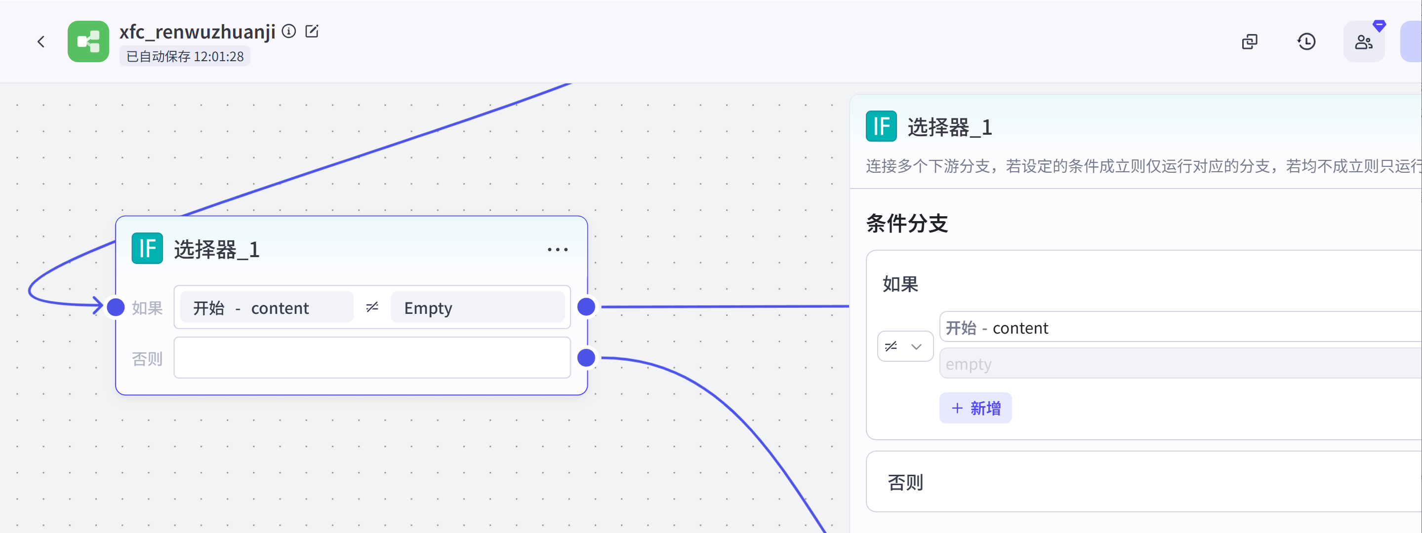 选择器:这个节点位于开始节点后,接收开始节点传入的content,判断content是否为空,若为空则调用下游大模型节点创建视频文案,否则基于文本处理节点对文案内容进行分段。