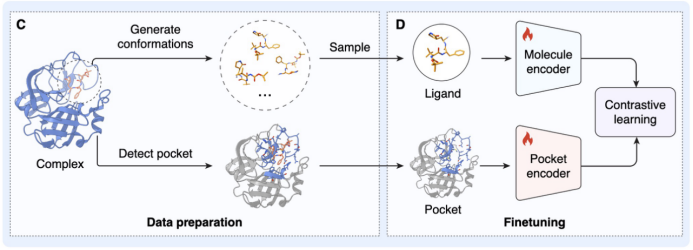 - 多尺度表征对齐: 团队通过训练两个深度神经网络编码器,将蛋白口袋的 3D 拓扑结构与小分子的化学表征映射到同一个高维共嵌入空间(Joint Embedding Space)。