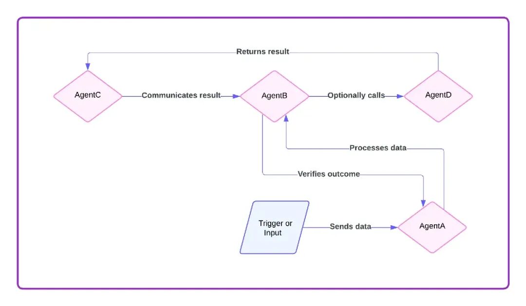 在多智能体架构中,多个智能体协作完成一个复杂的工作流程。每个智能体承担特定的职责:规划、检索、分析或执行,并与其他智能体沟通以推动流程前进。