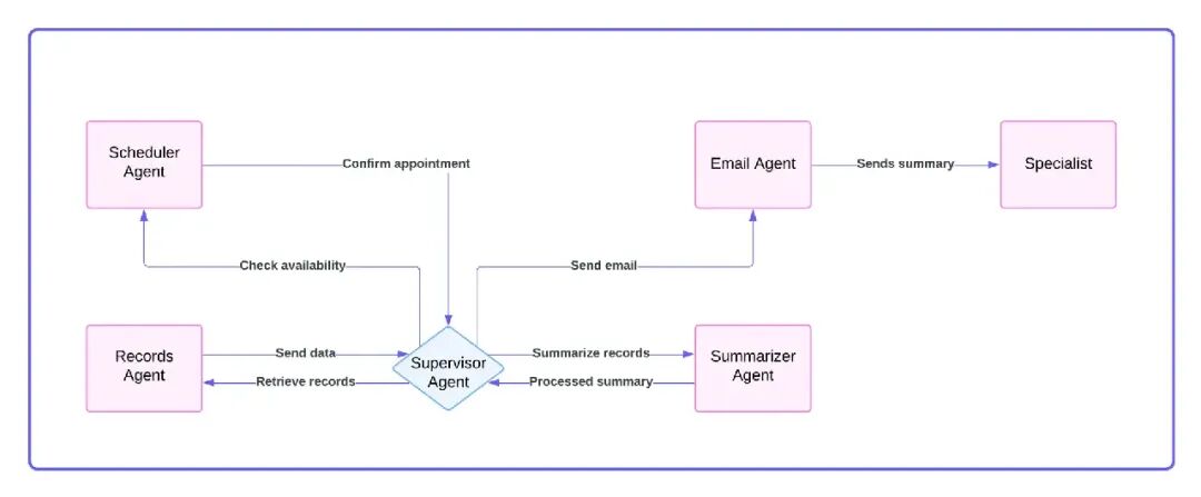 这种架构的一个实际应用可能是医院的专家预约系统。当患者发起请求时,监督者智能体控制整个工作流程:
