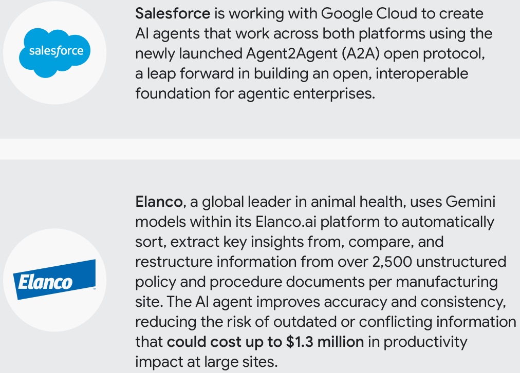 动物健康领域的全球领导者Elanco利用Gemini模型在其Elanco.ai平台中自动分类、提取、比较和重组来自2500多份非结构化政策和程序文档的信息。