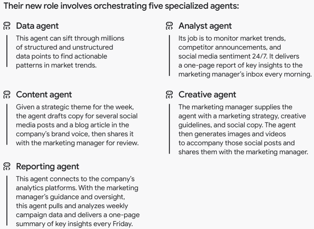 数据智能体负责筛选数百万个数据点以发现市场趋势;分析师智能体全天候监控竞争对手并每天早晨提交一页洞察报告;内容智能体根据战略主题起草符合品牌调性的文案;创意智能体根据策略生成配套的图像和视频;报告智能体则连接分析平台并每周五提供关键洞察摘要。