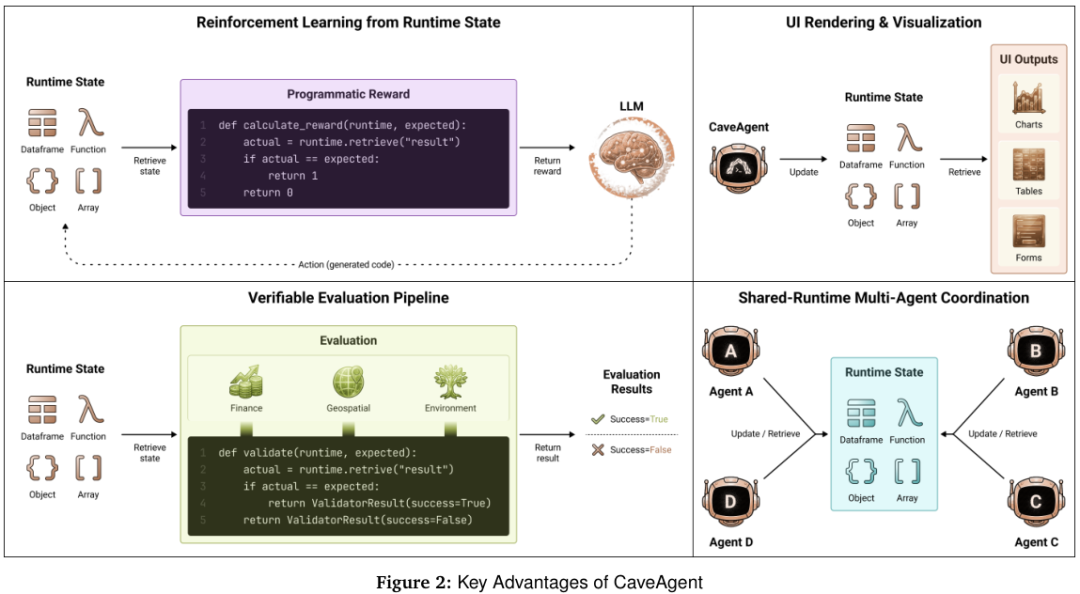 相比采用内化运行时的传统基于代码方法,CaveAgent将运行时开放为双向接口,允许开发者随时直接注入任意变量并检索结构化、可操作的对象,实现了真正的状态互操作性。