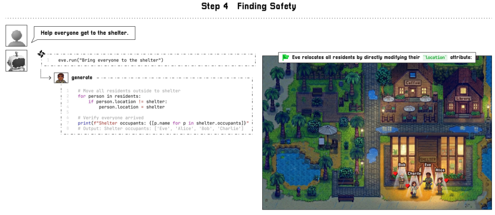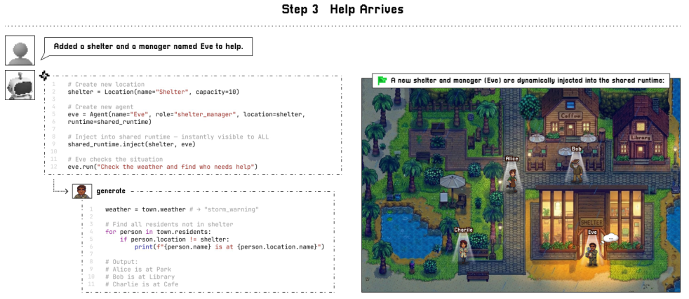 多个代理可以在统一的共享运行时上操作,实现隐式同步:当一个代理修改共享对象(如城镇模拟中的全局天气实体)时,该变化即刻被所有对等体感知。