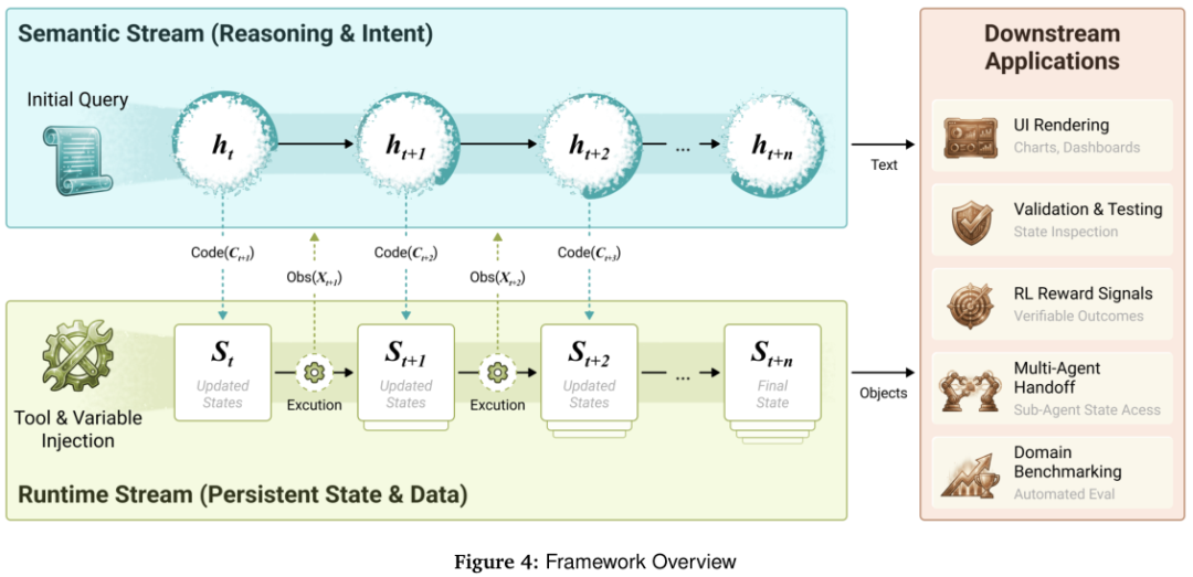 语义流负责追踪意图与轻量级推理,生成可执行代码;运行时流则通过这些代码维护所有关键数据与执行状态。