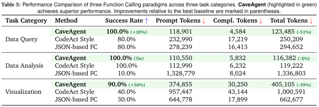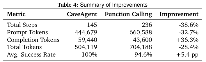 在物联网控制、金融分析与电商操作等领域,CaveAgent将总Token消耗降低了28.4%,同时将任务成功率从94.6%提升至100%。