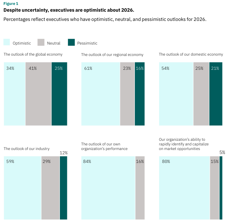 84%的高管对2026年组织的表现持乐观态度。54%对国内经济持乐观态度。34%对全球经济持乐观态度,而25%持悲观态度。