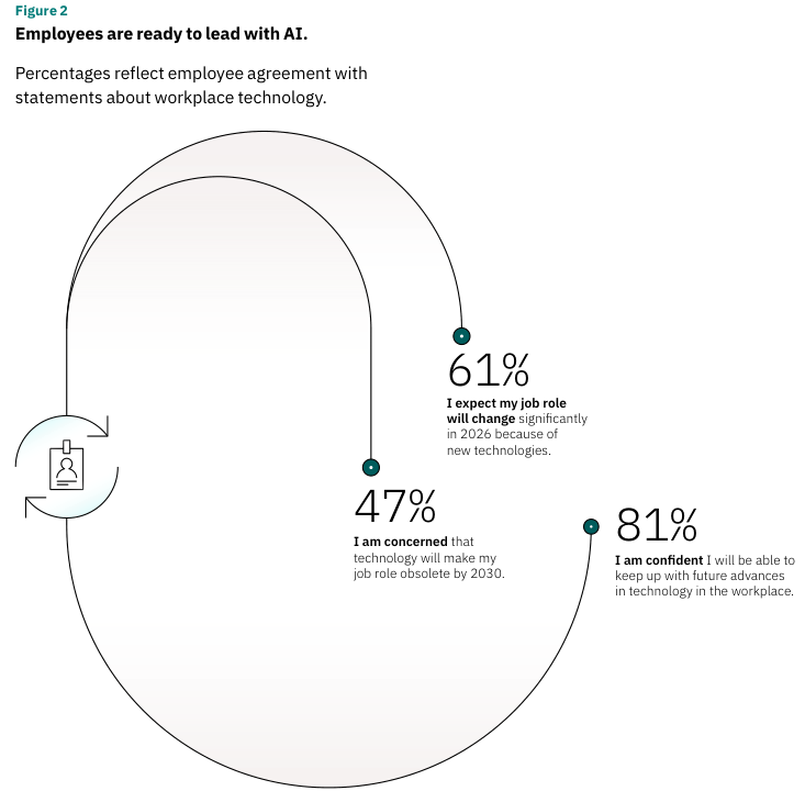 这种自信并非源于无知。61%的员工预计到2026年,由于新AI模型或AI代理等新兴技术的出现,他们的工作角色将发生重大变化。