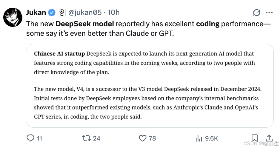 据The Information援引两位知情人士消息,DeepSeek计划于2月中旬春节前后推出其新一代大模型V4,主打编程能力,在内部初步测试中已超越Anthropic的Claude和OpenAI的GPT系列;该模型在处理超长代码提示词方面实现关键突破,并在整个训练流程中保持稳定的数据模式理解能力,未出现常见性能衰减问题,有望在复杂任务中提供逻辑更清晰、结构更规整的输出