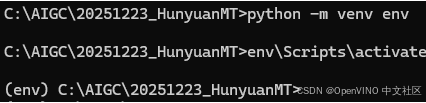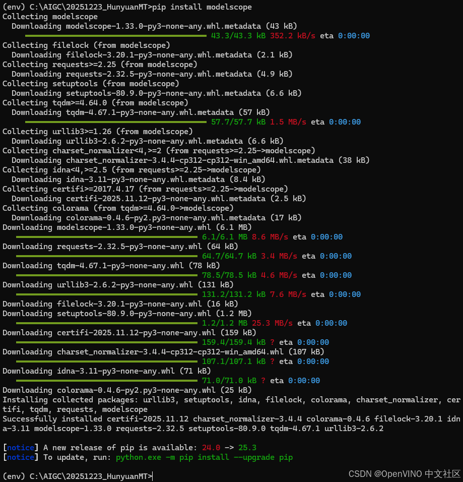 pip install torch --index-url="https://download.pytorch.org/whl/cpu"pip install openvino nncfpip install git+https://github.com/openvino-dev-samples/optimum-intel.git@hunyuanpip install git+https://github.com/huggingface/optimum-onnx.gitpip install transformers==4.57.3