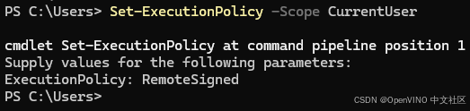 然后在弹出的ExcutionPolicy:提示符的后面输入RemoteSigned,然后按回车即可