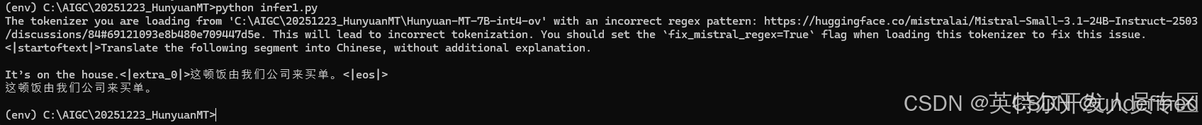 import openvino_genai as ov_genaimodel_path = "C:\\AIGC\\20251223_HunyuanMT\\Hunyuan-MT-7B-int4-ov-npu"device = "NPU"pipe = ov_genai.LLMPipeline(model_path, device)print(pipe.generate("Translate the following segment into Chinese, without additional explanation.\n\nIt’s on the house.”, max_new_tokens=2048))